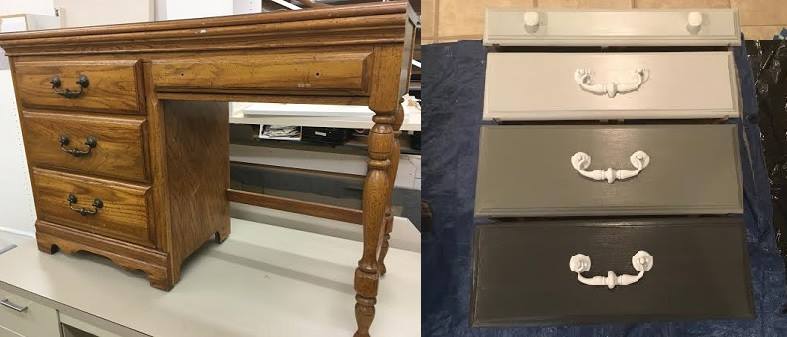 TIP OF THE WEEK: I’ve been working on a desk today that will be for sale soon. I am so pumped on how the drawers are looking, I just had to share. They are finished with 3 coats of poly and they are gorgeous. I’m calling this desk “Gray Ombre” as the drawers are varying shades of gray using Missouri Limestone chalk-based paint. Take a look at the drawer pulls in the original photo and then again in the finished drawer photo.