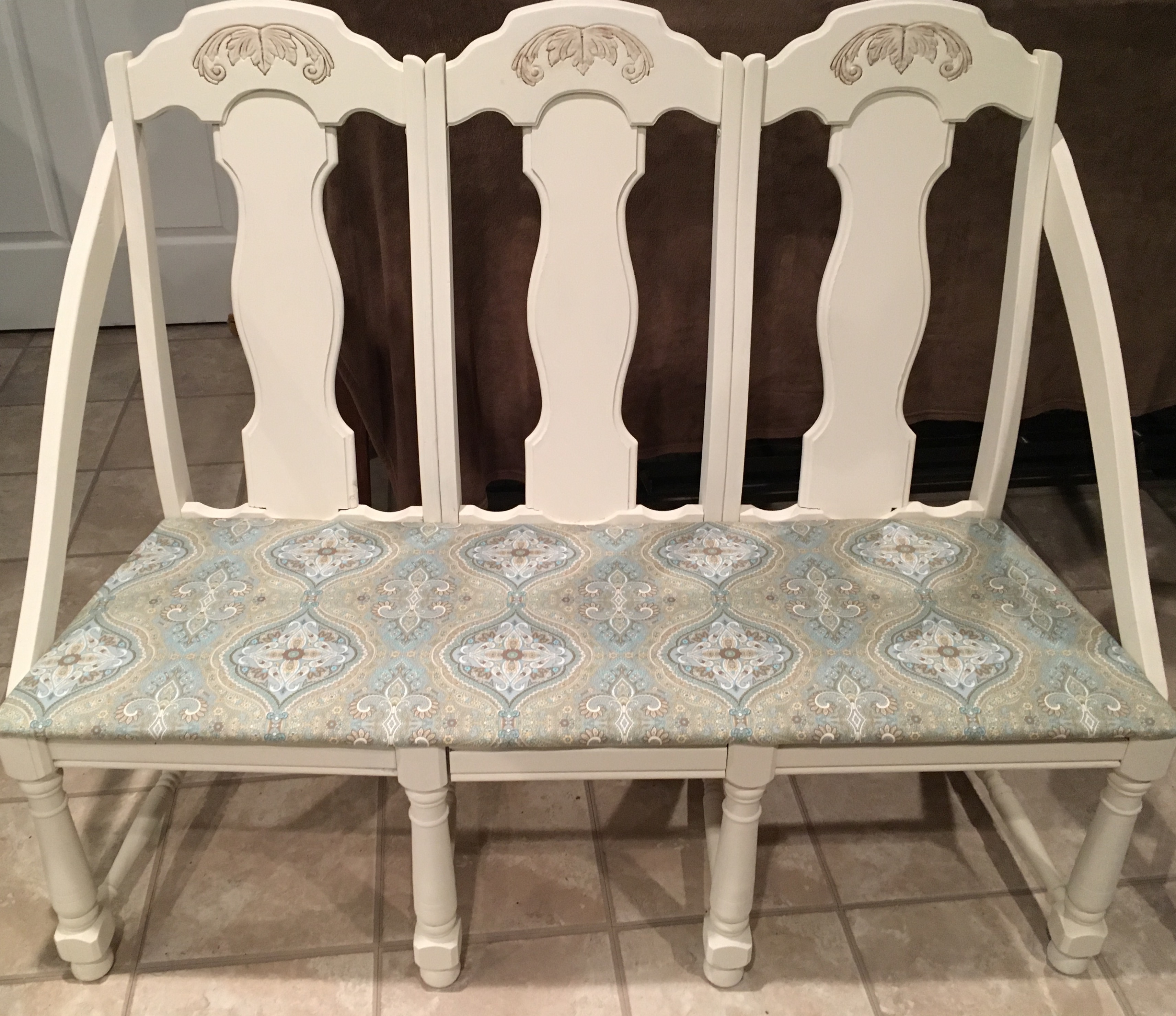 But, when it came to finding a small church pew, we were soon out of luck and time. Danny had often talked about trying to turn chairs into a bench after we saw one, so we started thinking about finding some chairs and trying that. Michelle found us 4 chairs and we were off to Pinterest to learn how to make one.