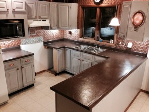 The counter top product we used is truly amazing: Daich Coatings Spreadstone Countertop Finishing Kit. It was a long process but well worth it in the end. To this day, it looks pretty much the same as the day we finished it. It is wearing very well and I am very happy with it. Our counter top was the 1980’s white “leather-look” laminate. I thought we would be able to sand it down, but that was wishful thinking. That laminate is tough stuff. So, underneath my lovely counter tops with flecks of colored stone, is an interesting “leather-look”, but it really doesn’t detract from the looks of the counter top at all. Read more about our counter tops on my Pinterest Board.