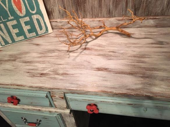 The drawers I painted with a couple of coats of a light turquoise with the paint we sell and use called Missouri Limestone Paint Company and the color is “Front Porch”. Love the name. Doesn’t it remind you of the color of the slats on the ceilings of the old farmhouse porches? I distressed the drawers a little, too. I even painted the cute little knobs I found at a yard sale and the wooden part of the handle with the color “Harvest Pumpkin”. I did seal those with poly. The drawers have a slightly gray shading to them. I did that by rubbing them with very fine steel wool. That really makes a nice look.