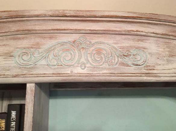 This hutch also had a corkboard. I painted it with a coat of Zinsser Bulls Eye Shellac first to keep the paint from soaking in too much, then painted a couple of coats of “Front Porch”. I used a little of the “Front Porch” to get into the grooves of the detail on the top of the hutch.