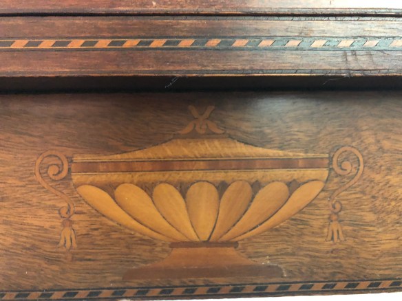 We have done some research and have found similar pieces online ranging from $300 – $10,000. Wouldn’t the high end be nice? Lol. But seriously, we would love to identify it so we can find a value and offer it to a collector who would appreciate the beauty, quality, age, character, and practical use of this beautiful piece of furniture. We am not sure, but believe the detail is inlaid, not painted. And yes, it has a few flaws, but the character flaws are just a part of its history.