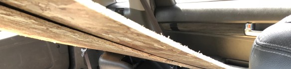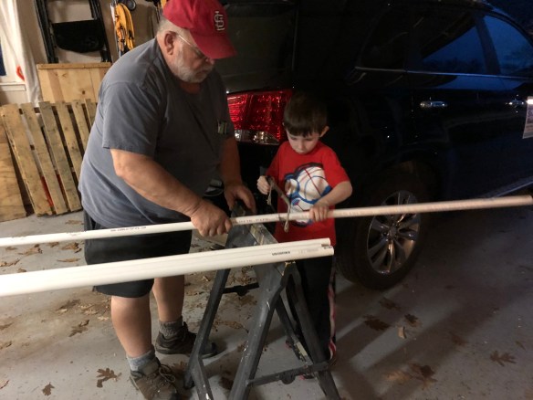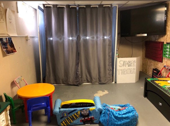We bought PVC pipe and connectors to create a frame around the stage, which was now approximately 43″ x 73″. The cost was approximately $40. We wired the frame to the ceiling. The two sheets of 3/4″ chipboard was approximately $10.