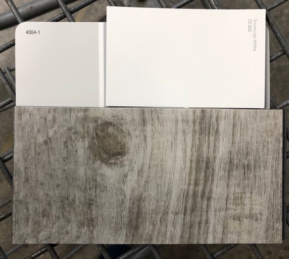 The walls were painted with Valspar “Tempered Gray” and the wainscoting and trim with “Snowcap White”.
