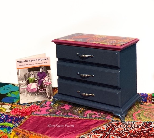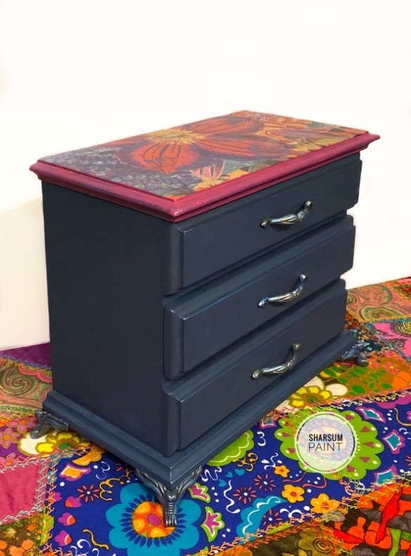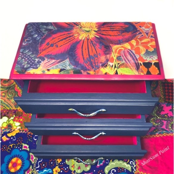 From the bright, colorful patchwork design on the top to the Cosmic Blue Gilding wax on the hardware and legs, this box will soon become a legend in its own right. The top of the box is painted with our Missouri Limestone Paint Company “Crepe Myrtle” under the Prima transfer and the rest of the box is our “MO Denim” color.