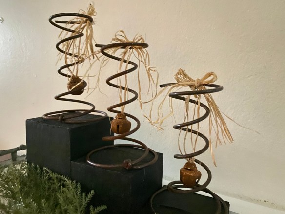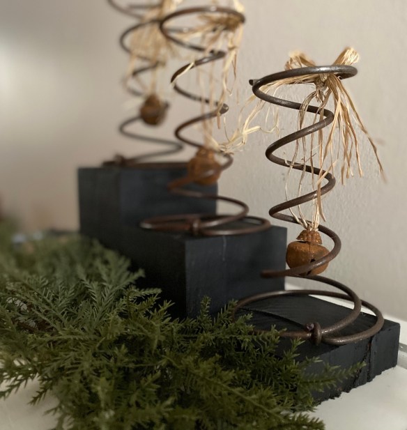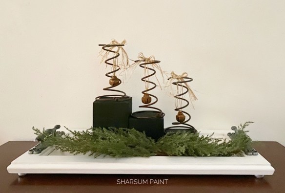 The greenery: I had the white frosted branches and don’t remember where they came from originally, but I’m sure something like them are available in most craft stores. The red berries are from Michael’s and the cute little pine cone is an ornament from Walmart. It came on a card of four.