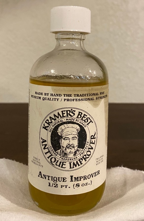 Meet Kramer’s Antique Improver, made the old fashioned way in Sugar Creek, Missouri. They advertise all natural ingredients – two of which are ingredients my dad used when refinishing furniture back when I was growing up….Linseed oil and Turpentine.