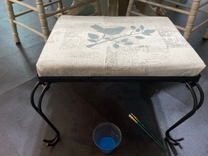 As I was reading there one day, I thought it would be nice if I had a stool to prop my feet on while I read. I just happened to have one in my basement I’ve had for years but wasn’t using. But it needed a new cover. No problem!