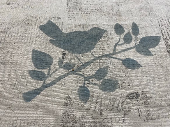 One day, when staging a piece of furniture I was painting, I needed a throw pillow. I took a piece of painters drop cloth (washed and dried it to make it a soft fabric) then used a French postcard stamper and Missouri Limestone Paint Company chalk-style Paint (the brand we own and produce) and stamped all over the piece. I then used a stencil and stenciled a bird on a branch on it. I wrapped it around a pillow and pinned it in place, took my photo, then took the cover off and stored it with my other fabric. (Hoarders do organize sometimes.)