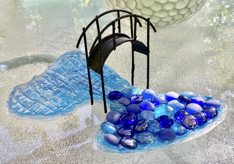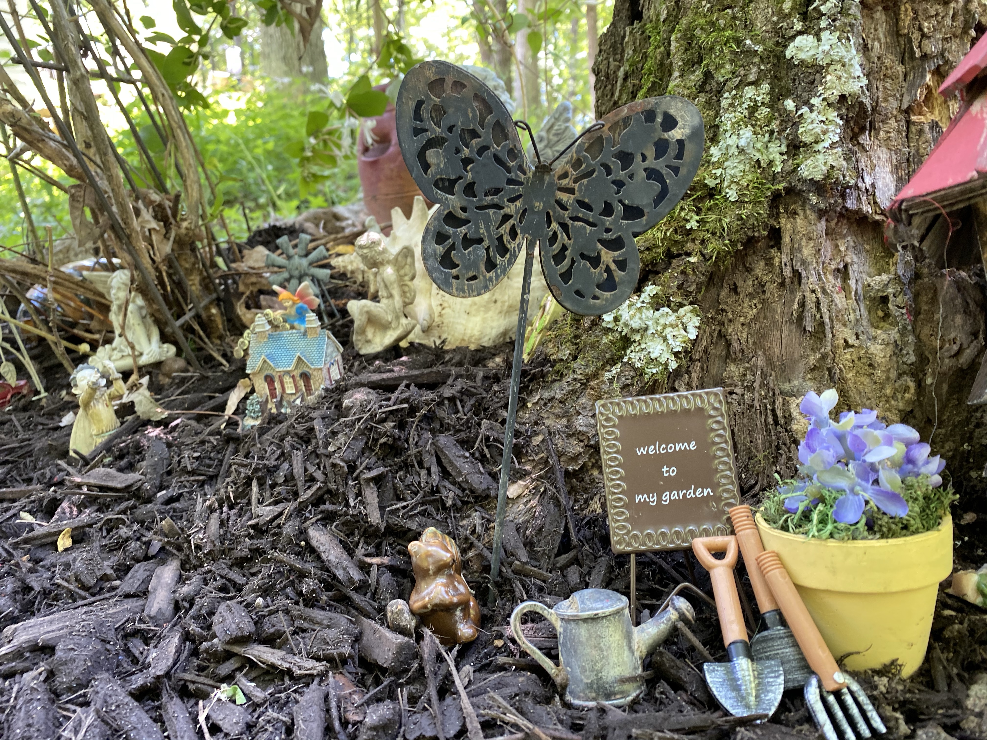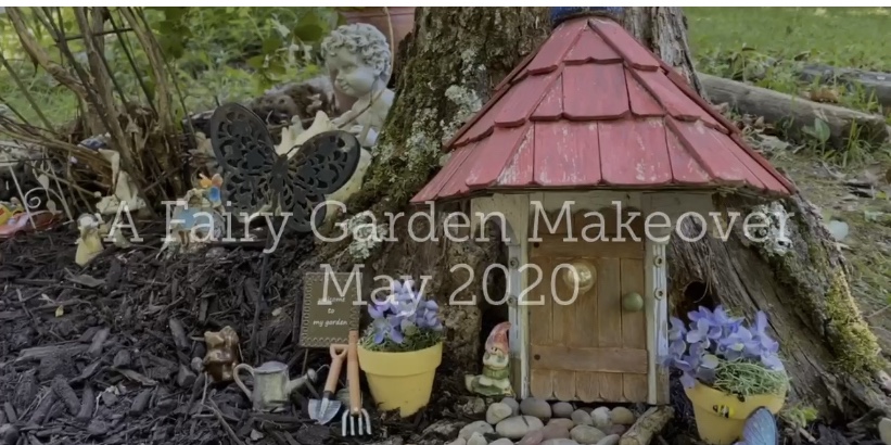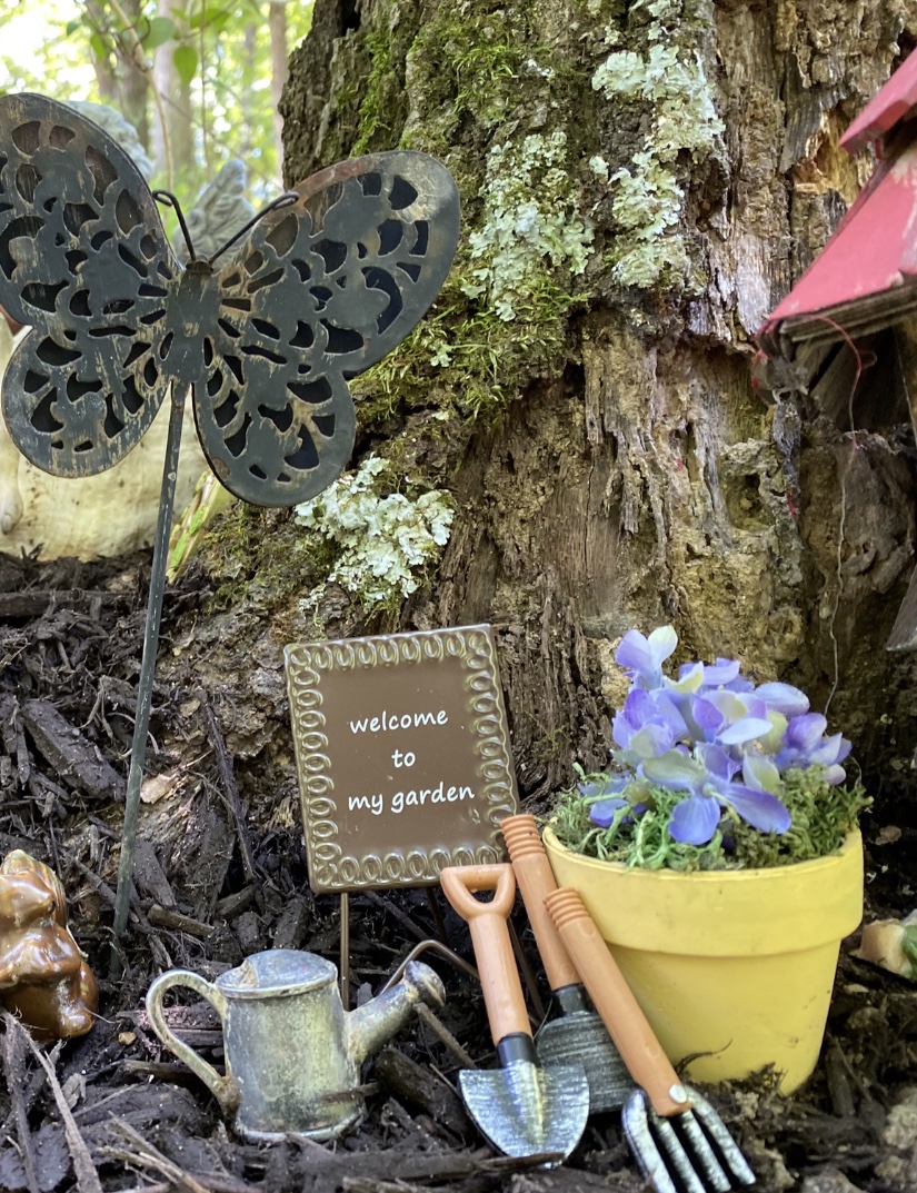 Here’s a video I made and below I will add individual photos and some hints on how I made my pond this year so you can get a better look and maybe some ideas to create a fairy garden of your own. Whether you have kids, grandkids, or none of the above, if you have never had a fairy garden, you should. They are a lot of fun to create.