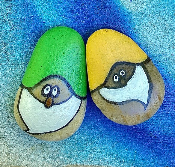 I have painted two rocks to look like gnomes and will paint two more for each grand and have them add to the garden. I painted them with Our Missouri Limestone Paint Company colors and then sealed them with spray lacquer.