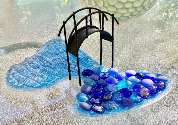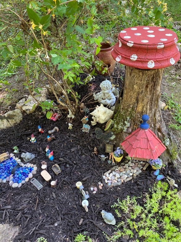 Here’s a video I made and below I will add individual photos and some hints on how I made my pond this year so you can get a better look and maybe some ideas to create a fairy garden of your own. Whether you have kids, grandkids, or none of the above, if you have never had a fairy garden, you should. They are a lot of fun to create.