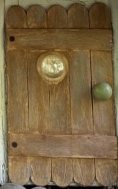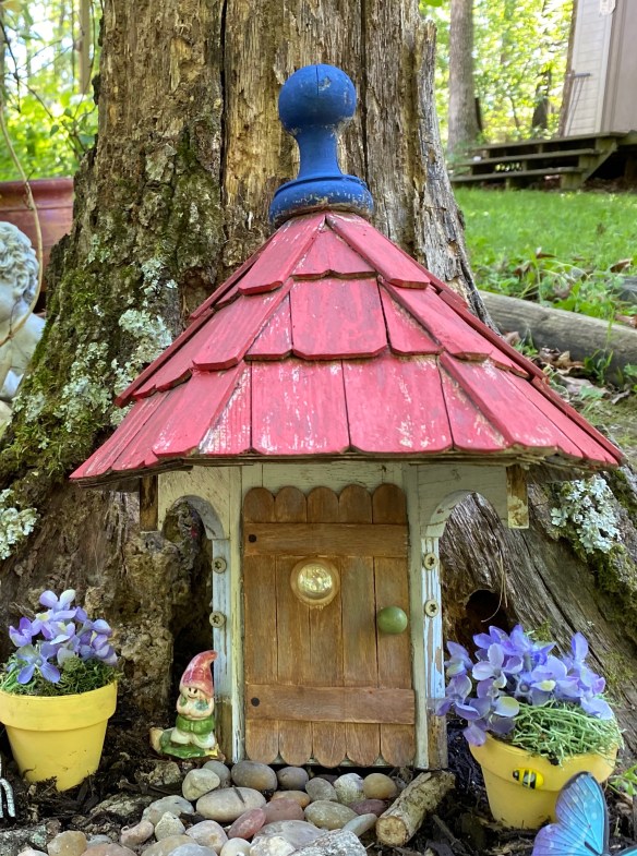 The roof was what was left from the bird feeder we had sitting on top of the stump the last several years. Danny reworked it and we were amazed the door fit perfectly inside the part it did. He attached the door and then screwed the whole unit to the stump. I gave it just a little paint so it still looked weathered.