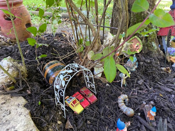 We started a fairy garden for our granddaughter about eight years ago. We’ve enjoyed adding items to it through the years. When we added grandsons it seemed only fitting the fairy garden had a carport and cars. It was time for a major makeover!