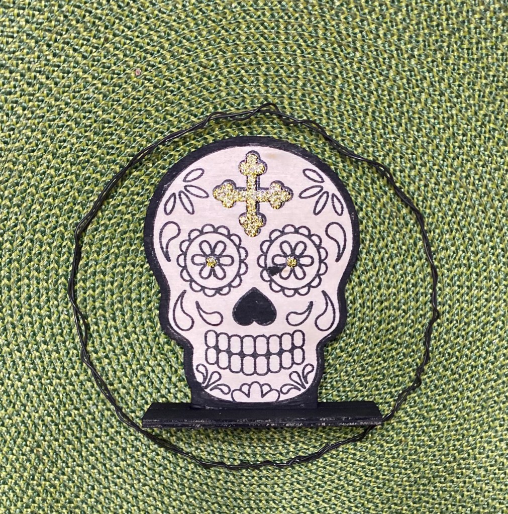 But, if you were going to use new pkgs of the DT mesh tubing, I would get maybe 3 pkgs (1 of each color). DT also may have a heavy wire that you can mold as shown below, and you will need the 3 1/2”x5” Day of the Skull paint kit. You will also need a pkg of pipe cleaners. I chose to use black.