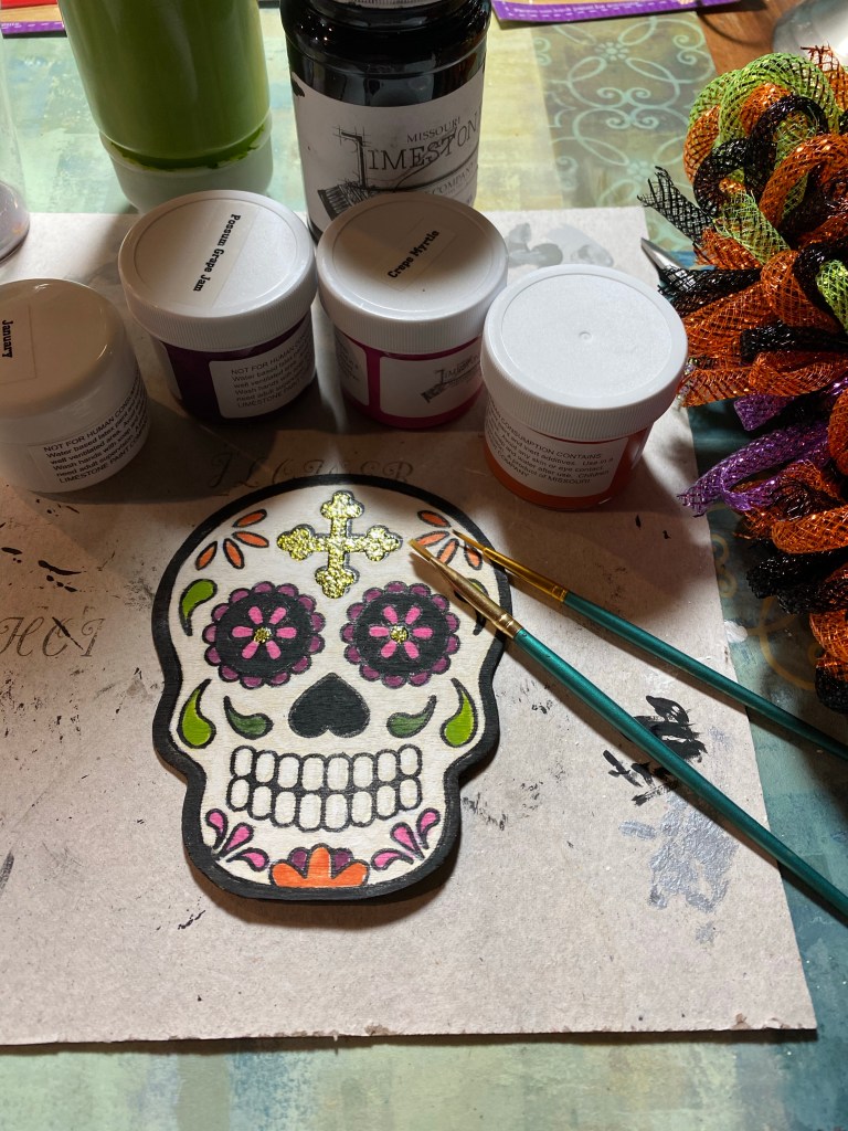 I had a small Dollar Tree Day of the Dead skull painting kit I used for this one. It is approximately 3 1/2” x 5”. It comes with several craft paints, but I chose to use our Missouri Limestone Paint Company chalk-style paint colors instead. I love how vibrant they are, but many chalk paints would work, too, as well as the paints that came with it.