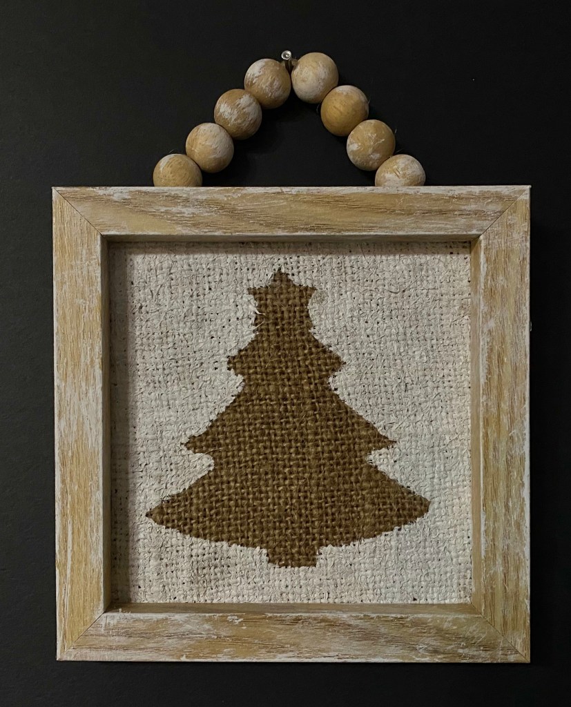 I then used scotch tape and taped the Christmas tree onto the burlap to help hold it and daubed white chalk paint all around the stencil and the burlap.