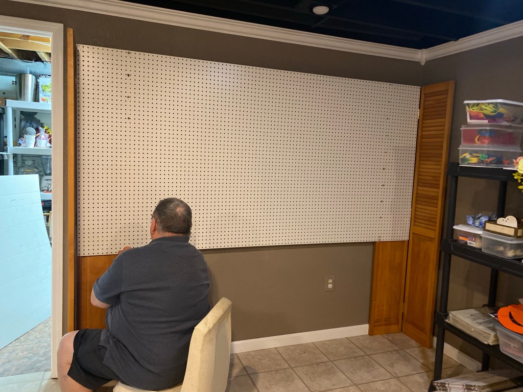 He came up with an idea he was sure would work. He wanted to attach the peg board to two bifold doors and make it free standing. So last night we went to Lowe’s and purchased a peg board for around $20. I also bought a box of hardware for $13 and we have more here. We had two nice bifold doors with hinges someone gave us and got to work.