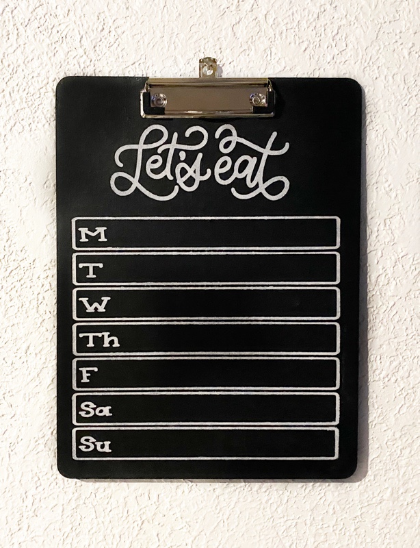 I used a cut file I purchased with a commercial license from https://dawnnicole.co so I could legally sell the menu planning clipboards I created.