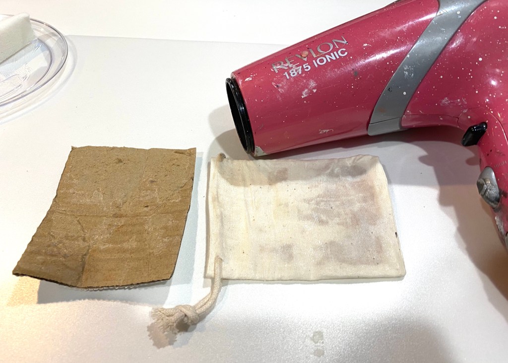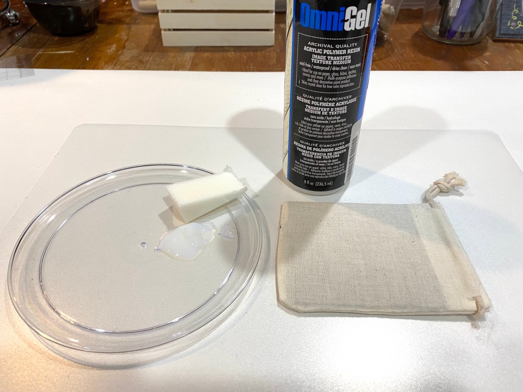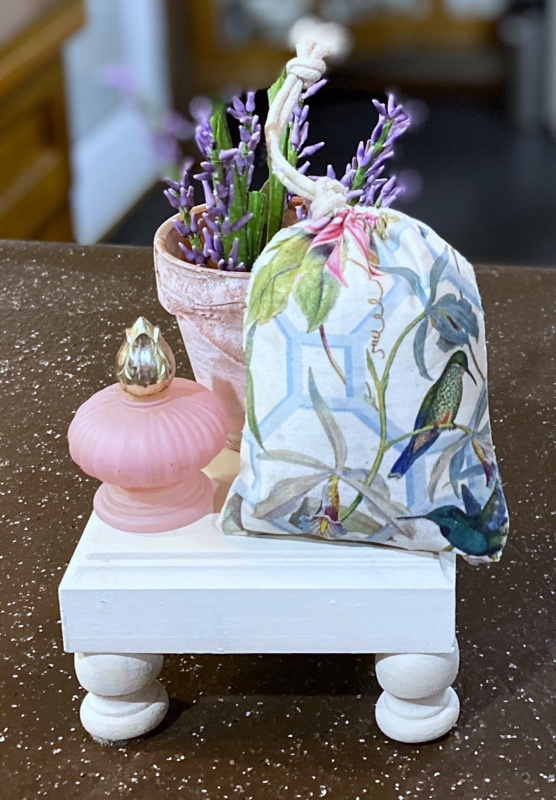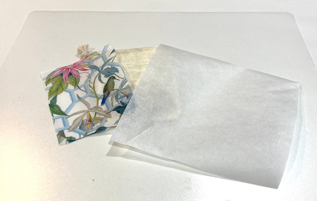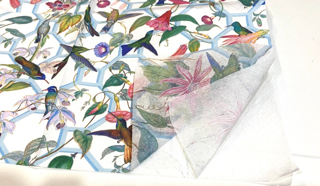 The first thing I did was cut a piece of cardboard to fit inside the bag so I didn’t get the gel medium I used on the other side of the bag. I could paint the top of the bag white as this will make the napkin really stand out, but this cotton bag is so light, it should work fine as is.I use Omni Gel (I purchased this on Amazon but I have seen it in craft stores) as I love how easy it is to apply. You can, however use Mod Podge to decoupage, among other mediums. I’ve even used water-based polyurethane sealer! I daubed the Omni Gel on with a makeup sponge. I ended up using more than what I have on the plate.I covered the whole front of the bag, even over the drawstring. Later, I almost regretted that as it kind of glued the napkin to the drawstring, but a little pushing worked it loose and it was fine.I immediately removed the cardboard so it wasn’t glued in. I think a piece of heavy vinyl or plastic might even be a better choice. And then I used a hair dryer to quickly dry it.I have collected so many beautiful napkins it was hard to choose, but I chose the one with hummingbirds because of the pretty spring colors.Napkins are usually 2 or 3 ply. This one is 3 ply. You need to pick at the layers on a corner to peel all the layers off until you are left with the printed transparent layer.I then cut the napkin to fit the top of the bag and cut a piece of parchment paper to place over the napkin when ironing. The parchment paper is crucial!!! Do not forget to use it or you will have napkin stuck on your iron.I put the piece of cardboard (not shown) back inside. This gave it a nice solid base and kept the two sides of the bag separated. I then started ironing with the small crafting iron I purchased on Amazon but any craft store carries them. I would lift up the parchment paper every so often to make sure the napkin was sealed onto the bag. You can use a regular iron, but this one is very handy for getting into small spaces. Note to self: do not move the little stand after iron heats up so you can take a picture. The wire gets really hot and seared my finger nicely. Ouch!I then stuffed the bag with poly fill (you can get this at any craft store or even use the fill from an old pillow). I pulled the drawstring tight and tied a knot to hold it. My tiered tray pillow is now completed and on display.