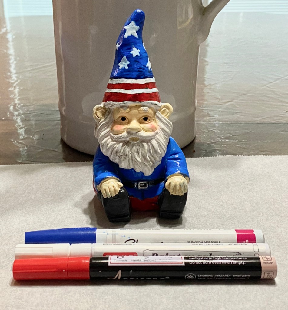 Once I gave this little garden gnome a patriotic outfit with paint pens, I had to go on a hunt around my house to find things to display with him.