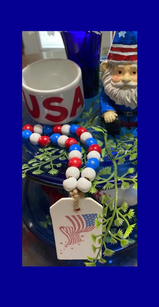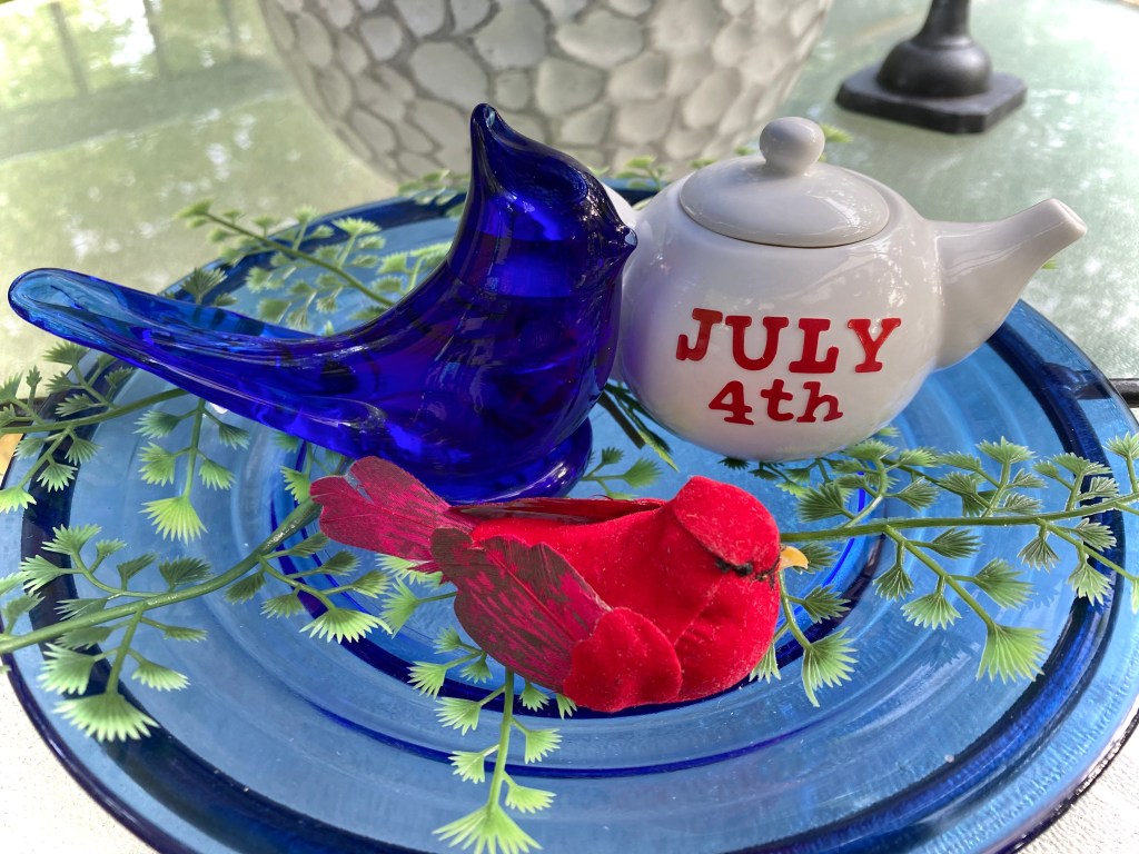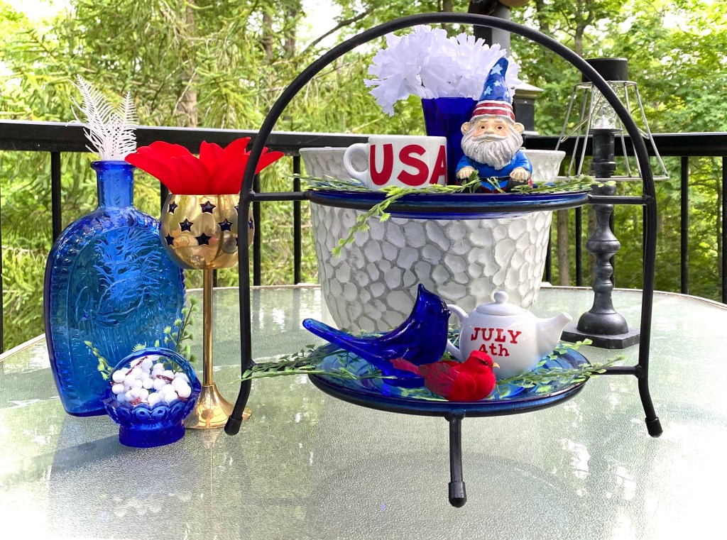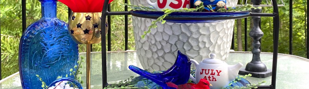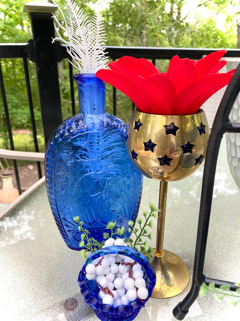 This display shows that tiered trays don’t have to be elaborate and how you can use items around your house to create themed tiered trays. The display will be available at our booth at The Gray Wall in Sullivan, Missouri, just in time for the 4th of July. I also will have quite a bit of cobalt blue depression glass from my own collection that will be available. It is so beautiful, but I just don’t have room for it anymore. And how perfect for your July 4th celebrations!