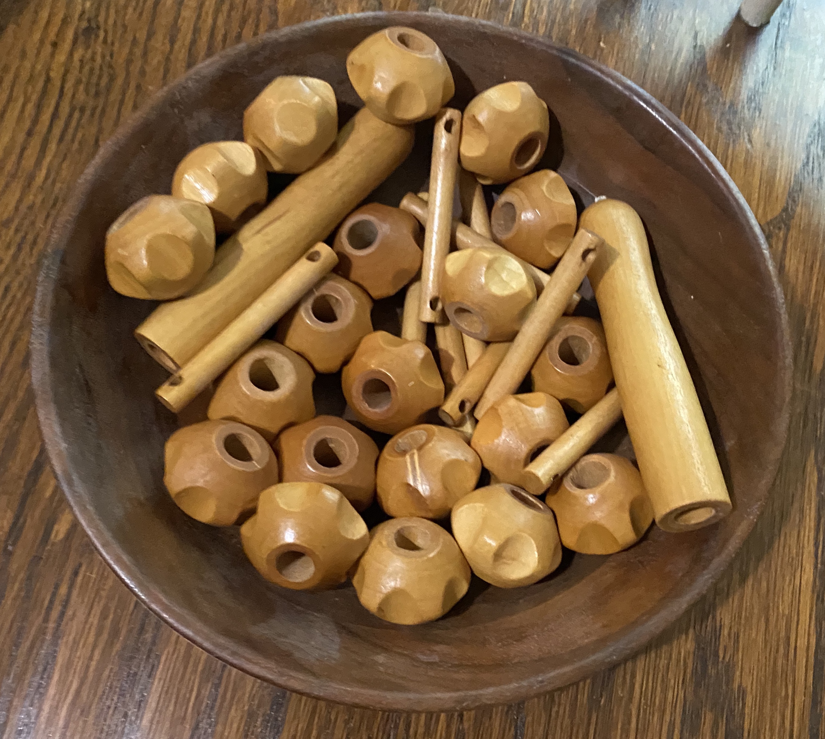 So, I cut it apart and saved the goodies. Just look at those beads! They will make great legs for tiered trays or maybe even wooden bowls!