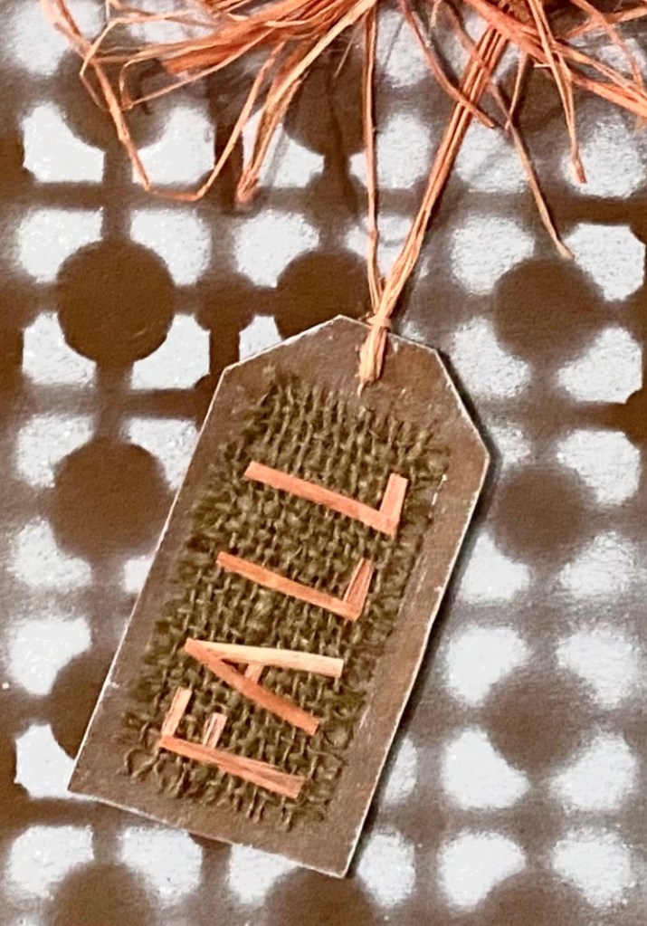 I made a little tag from some balsa wood and stained it. I saw an idea on a YouTube video to use a piece of burlap, fray the edges and create letters from raffia. That worked great! Then I glued the burlap to the tag. I used the same raffia to hang it from the stem, gluing the down to keep it place, then created a raffia bow.