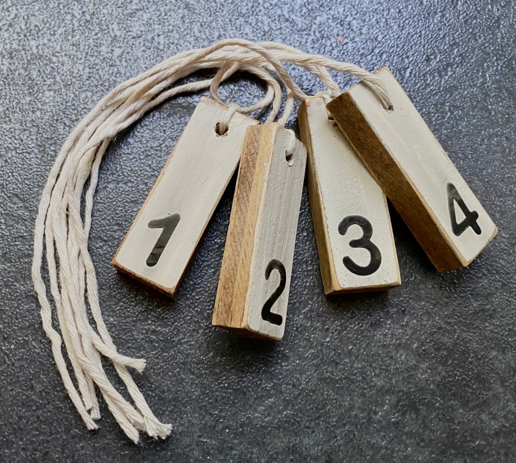 So here are 4 “just because” number tags I made this morning. They do look pretty neat on these wooden crates. 🙂 Dollar Tree Jenga blocks – hole drilled for string, antique wax, painted, sanded, and number stickers applied. Sealed with clear wax.