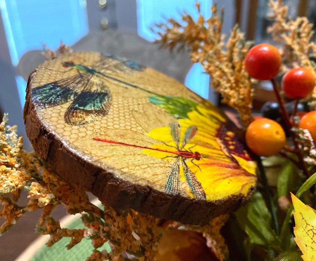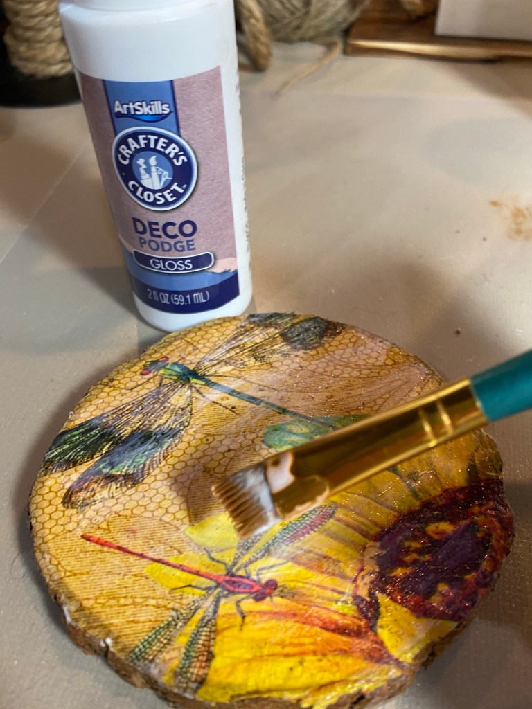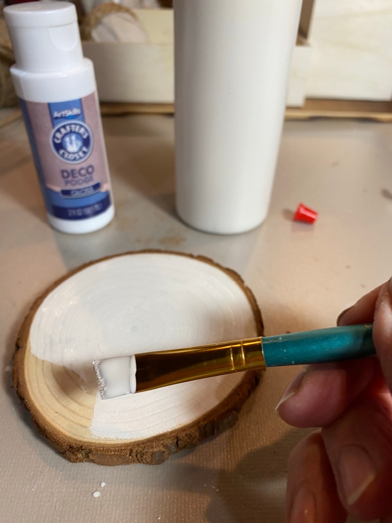 3. I then gave the wood slice a nice even coat of the decoupage medium from Dollar Tree, making sure it was all covered, all the way to the edge.
