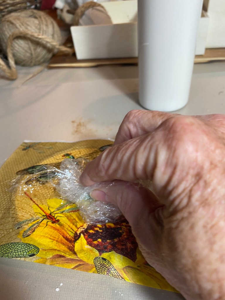 4. I carefully placed the tissue paper over the wood slice where I wanted it and then pressed it down and smoothed it out all over with a piece of wadded up Saran Wrap. This allows the tissue paper to adhere smoothly with no wrinkles. Again I used a hair dryer to speed up the drying process.