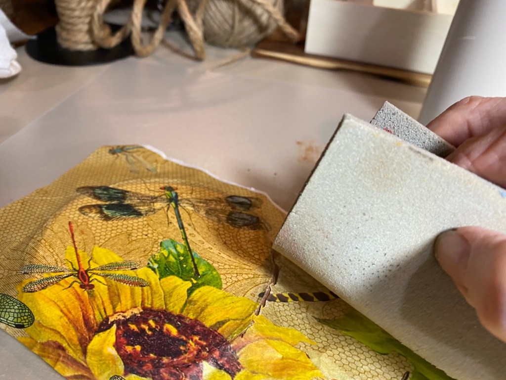 5. I used a piece of fine sandpaper and went in a downward motion all around the edge to remove excess paper. This keeps the tissue paper from tearing. Do not go back and forth.