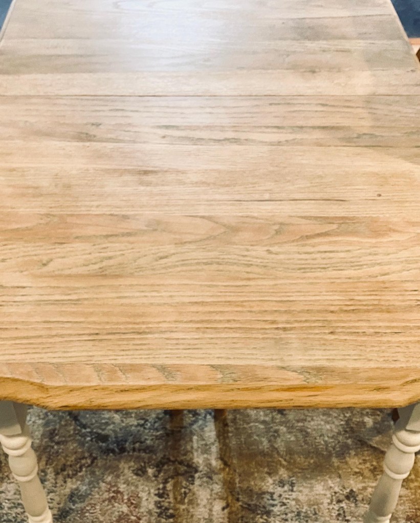 The top, which Danny stripped, sanded and bleached, has 5 thin coats of Varathane crystal clear water based matte polyurethane, yet it looks like nothing is on it. It has character marks but so pretty! The legs are painted white with 3 coats of the polyurethane.