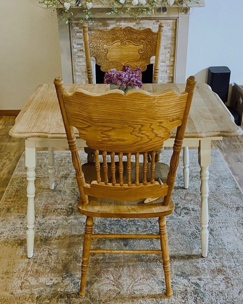 He stripped and sanded the chairs and they also have 3 coats of the polyurethane. The chairs go well with the table.