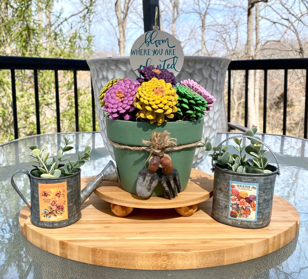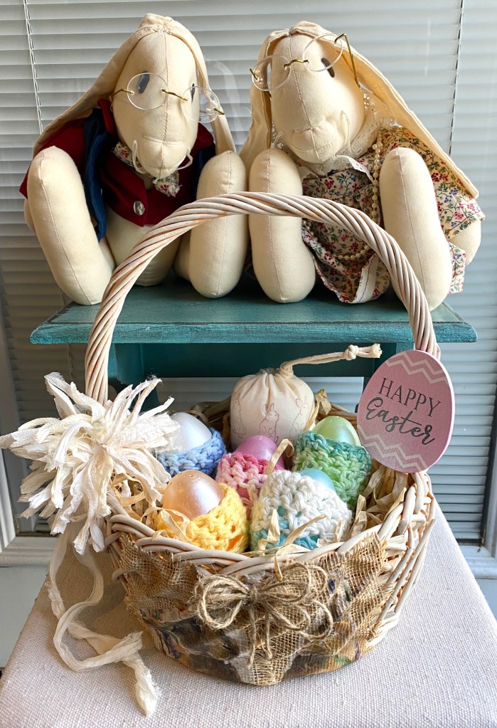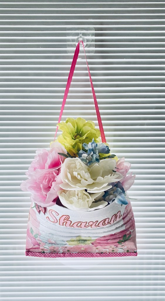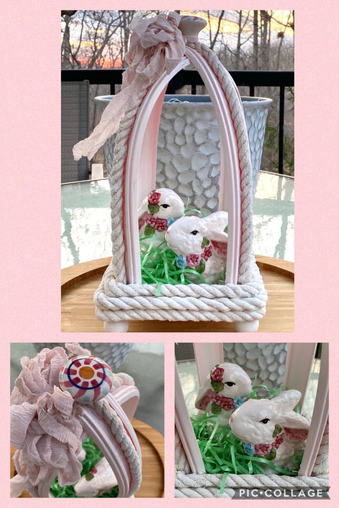 For the basket, I painted it an off white. I cut out and glued bunnies from a napkin to some burlap type fabric with spray adhesive, then Mod Podged them to the basket and added a little jute twine bow I made. I crocheted egg covers last year and I stamped and stuffed the little fabric bag last year, too. I sprayed plastic eggs this morning with Mod Podge pearlized spray to make a soft shimmer. I also sprayed the Happy Easter sign and attached a skewer stick to the back. I made the bow with some awesome fabric yarn I have.I had a Dollar Tree tinsel rabbit face and purple yarn. I wanted to see if this yarn would work. I started at the bottom and made sure the loops lay so that I covered them all the way to the neck when I wrapped the yarn around. Then I did each ear individually and started from the top, making sure the loops lay so that I covered them and ended up meeting the other loops at the neck. I think it gives her a French Poodle haircut. 😁 I reused the eyes and mouth and used felt for the nose and inner ear pieces. I had purple ribbon the exact color. I wired it on and added a jewel in the center. She turned out pretty cute, I think.I’ve had several friends over the last couple of years shared with me examples of crafters that have painted pinecones to look like zinnias. I got out that bag this morning and the pinecones it held were the exact kind I needed, so….. I painted and planted some. I also had the little sign so I cut the “bloom where you are planted” out of vinyl and added to the sign. I also had these cute little tin containers so I planted some faux greenery in them.You can bring this sweet girl out year after year. She looks good enough to eat, doesn’t she? But she is just a styrofoam bunny. I gave her two coats of a dark chocolate brown – Missouri Limestone Paint Company “French Roast”. I even gave her candy/like eyes using white and pink paint pens. I then sprayed her with a clear gloss spray to seal in that rich color. I added a bow around her neck and stuck in and glued a skewer stick in her bottom, cut to fit the bowl, to help her stay upright in the white shredded filler. I painted, distressed, sealed and waxed a wooden bowl for her and she is now complete.I made the Dollar Tree racetrack cloche. The interesting thing is that the white and orange gave it a pretty pinkish cast, so I left it like that. I sealed it with clear matte spray and a coat of Pearlized Mod Podge. I also added nautical rope all around and painted it, too. I added a pretty ceramic drawer knob to the top and paint dyed some gauzy fabric ribbon to put around it.I used paperback books and covered each book with this cool vinyl wallpaper I thrifted. Made a messy bow, spray painted some keys, added a Dollar Tree wood cut out bird, and tried to used the Dollar Tree Transfer words. They didn’t want to cooperate with the uneven vinyl, so I did the best I could then hand wrote the letters over the glittery gold with a metallic gold marker pen.I think I could easily become addicted to making these flowers. I did a lot of searching and finally started finding some using some of the vintage twisted paper I thrifted. Even the tutorial by Artful Affirmations I found on this flower was from 2016. It was very popular in the 80’s but not so much now. It looks like crepe paper, but is much sturdier. This paper, and the little heart shaped plastic box came from the grab bag I got at a thrift store. The flower adhered inside the box is sitting on a napkin. Tutorial found on Pinterest by Artful Affirmations.I saw a technique to use hairspray when you were wanting small crackles. It works! 🙂 I cleaned a 40 oz. tomato juice can and then sprayed it with a clear sealer to help the chalk paint adhere. I let it dry and then sprayed a heavy coat of hairspray all over. I dried it with a blow dryer then put on a thick coat of chalk paint, painting in one direction and did not go back and forth or overwork it or the crackle won’t happen. I then used a hair dryer and the crackled appear. The hair dryer seems to make better crackle. Do not use screws to attach the handle of you want it to hold water.This was the first can I made. I had this old chippy handle I wanted to use. I attached it with screws (not a good idea if you want it to hold water. It didn’t matter on this one because I cut both ends out of the can! What was I thinking!!! I guess I thought I was going to make a smashed can basket. It holds faux flowers, nicely, though. I ended up putting a fake bottom on it because every time I picked it up, the flowers dropped out. Lol