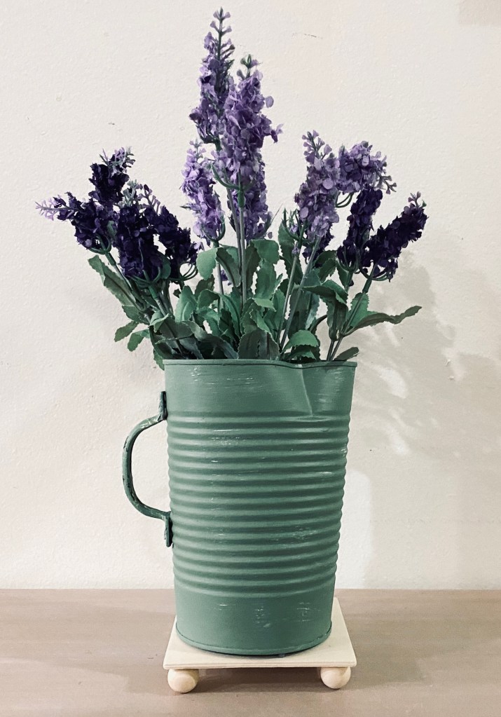 I painted the tin with 3 coats of our Missouri Limestone Paint Company “January” and let it dry. Then I gave it a coat of Mod Podge clear matte spray, followed by Mod Podge Pearlized Glaze spray.
