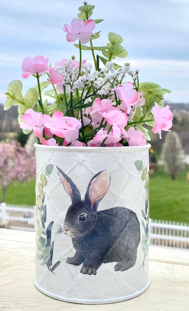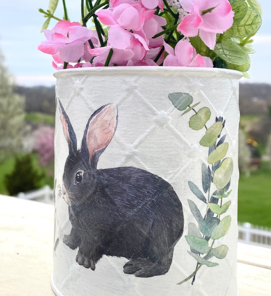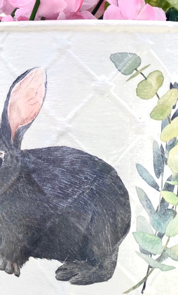 I was going to paint a duck today, but instead decided on painting this little 4 1/2” tall by 3 1/2” round embossed galvanized tin. I brought the perfect bunny framed with greenery Prima transfer I bought at The Gray Wall to go on it.