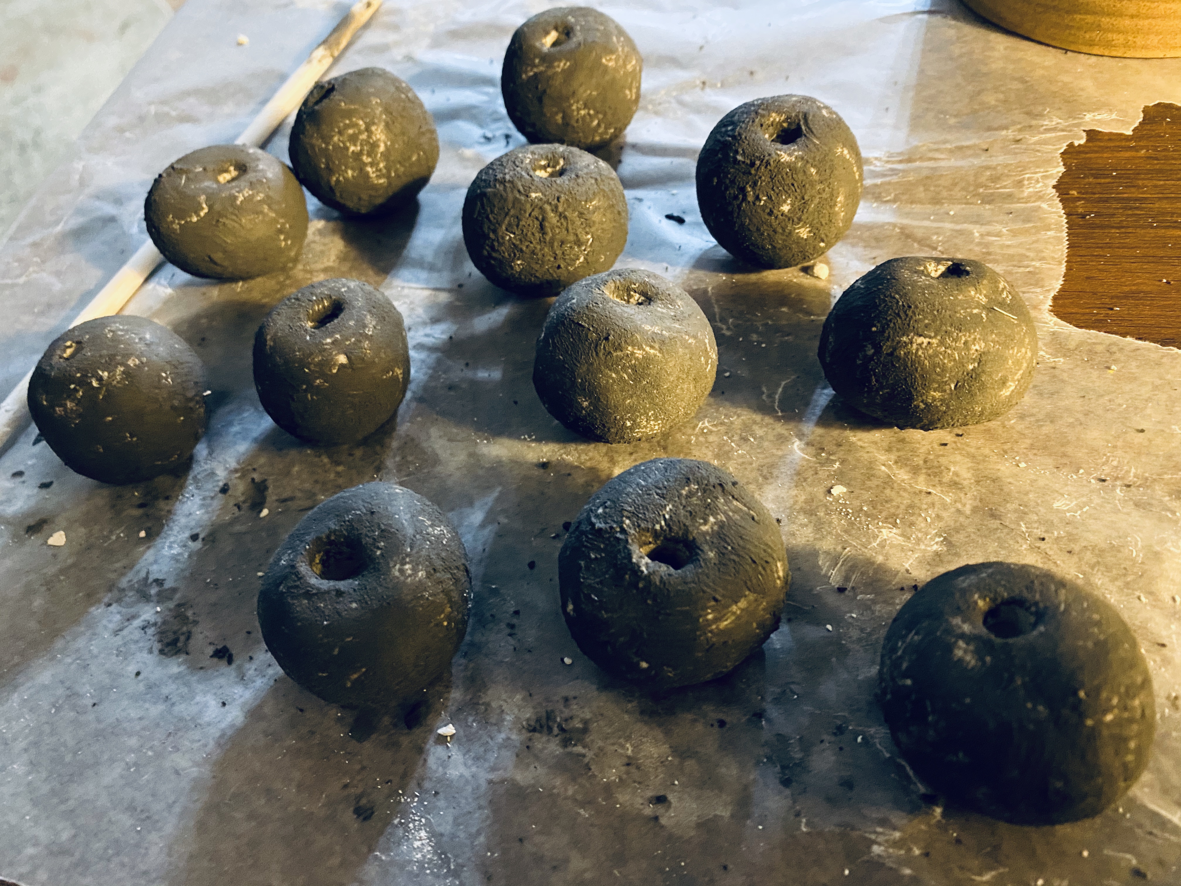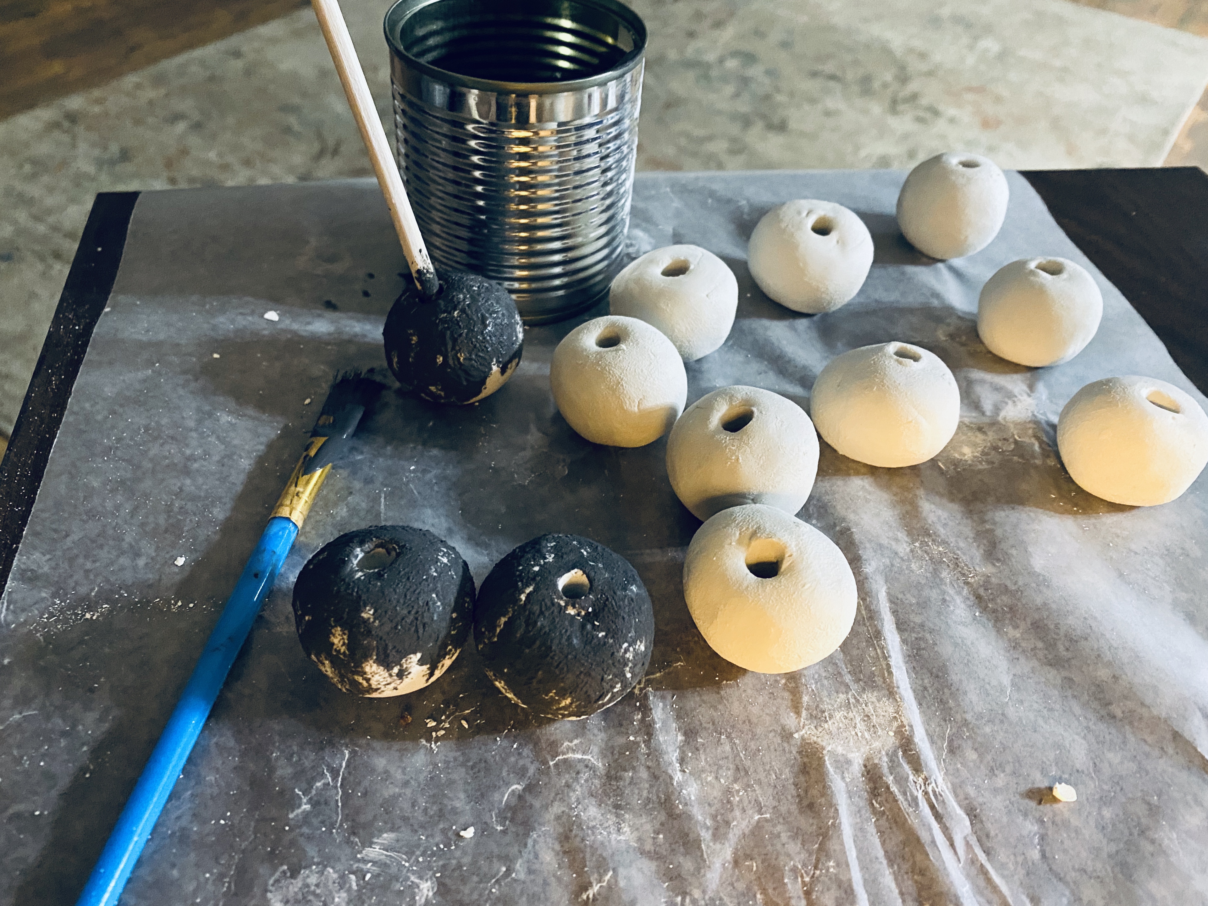 So…. last night while watching TV, I rolled some clay into approximately 1” balls and poked a hole through using a chopstick. This left a big enough hole for some thicker jute rope to go through.