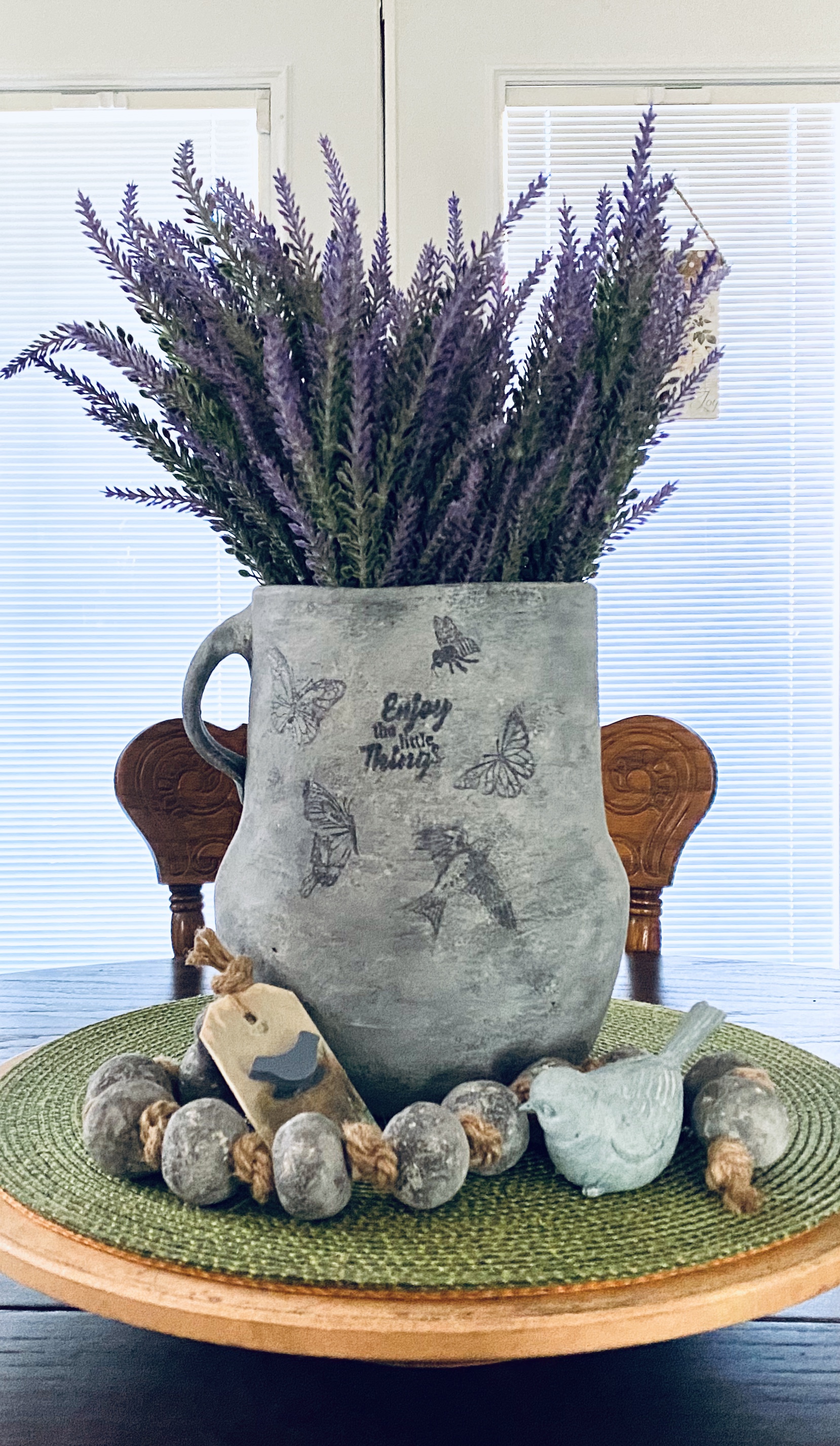 I added a few more stamps and this one is going on my dining room table. I’m sure I will be making some more aged stone look vases, even if they once started out as glass jars. 🙂