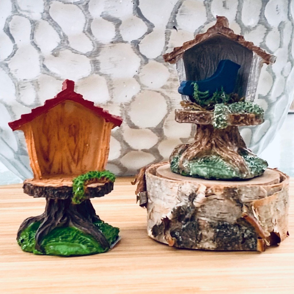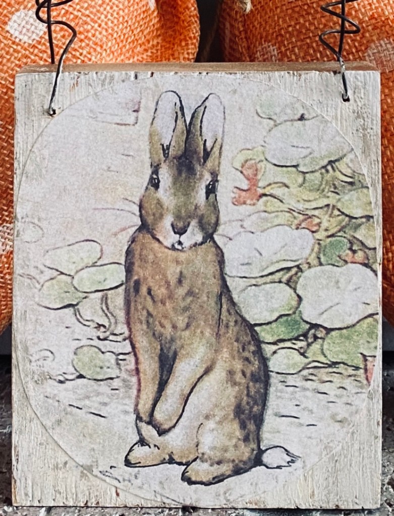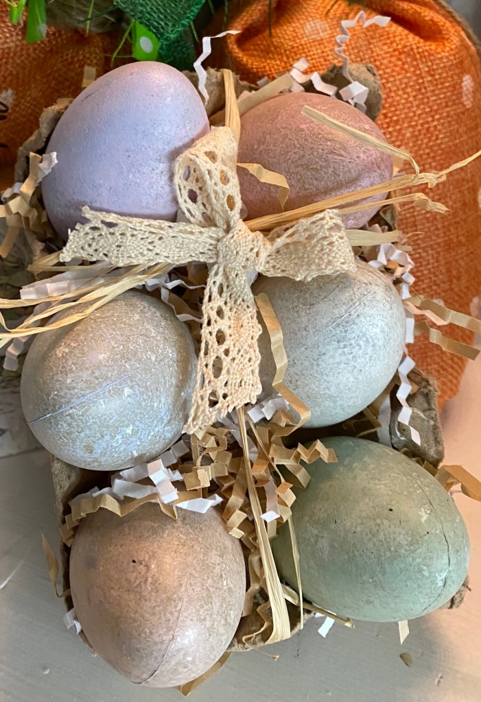 I painted and distressed this 6 pack of Dollar Tree eggs.I went to an Antique mall and came out with some bargains. Then I had to go to Dollar Tree to pick up a cute little bunny. So, basically I just added some rub on transfer carrots to plastic eggs, changed out the greenery on a carrot I had, changed the bow on the rabbit, coffee died some white filler to an off white and mixed it with some brown filler and created this 6” high x 12” wide display.The little stand alone Peter Rabbit was a little 3 1/4”wide x 3 3/4” tall vintage sign with a fabric heart glued to it, probably from the 80’s. Danny sanded off the top and I repainted it white and made a copy of Peter Rabbit from a book I brought with me, cut him out, glued him on, then lightly distressed him and the white paint. Then I sealed him with a clear spray sealer.Dry brushed metal cross wired to a dropcloth covered wire wreath form. Wire hanger in back.I finished another nursing home door hanger. This one is for a friend for the birthday of her friend’s mom.I reimagined a little Dollar Tree birdhouse with paint and stain, then sealed it. I painted a little wooden bird and glued it and a little moss to the birdhouse. I adhered it to a birch round to create a 4” high x 3” wide display. The original birds house is next to it to show what a difference a little paint can make.The little posey pockets look like they could be tiny tin can pockets I’ve been making, but they aren’t. They are made from cardboard tubes. I saw someone do this by cutting a tube about 2” long, pressing the bottom together and gluing it. I painted them white. I took the white part of a napkin layer I saved and used various stamps I had to make my own napkin, then cut and decoupaged the pieces onto the little pockets. I added dragonfly stickers to the board and to the pockets and filled the pockets with Spring flowers. I glued them in so they would stay. I gave the grapevine some white dry brush over the original color of the sign.