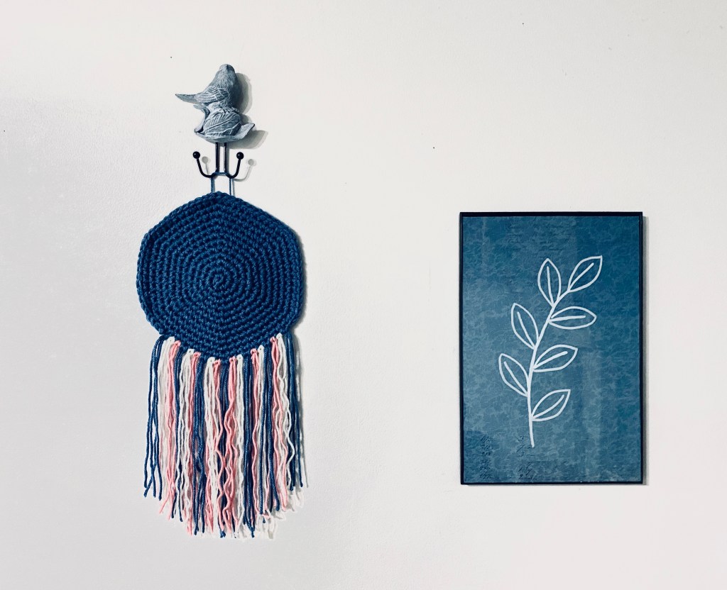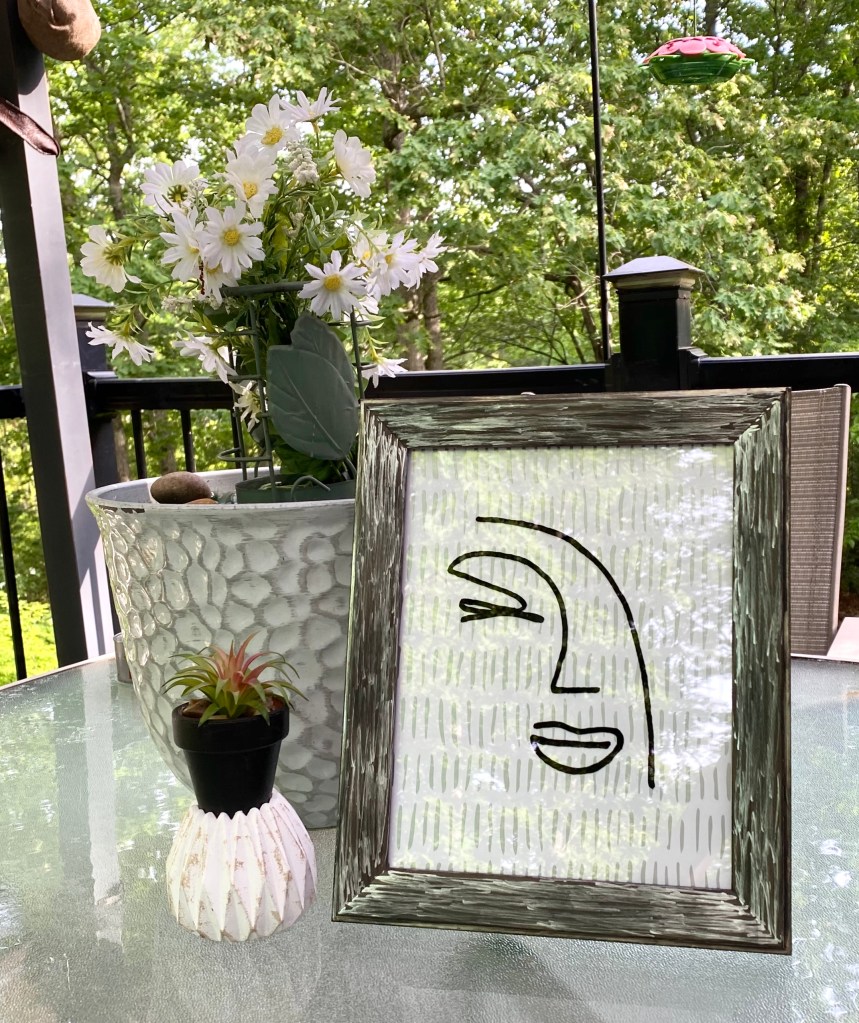 This is line art I created on glass – by tracing a print out with a metallic paint pen . 🙂 This YouTube channel video has many great ideas that think fit right in with this modern boho style. This project I saw on the video, by Katie Bookser, in particular caught my eye.