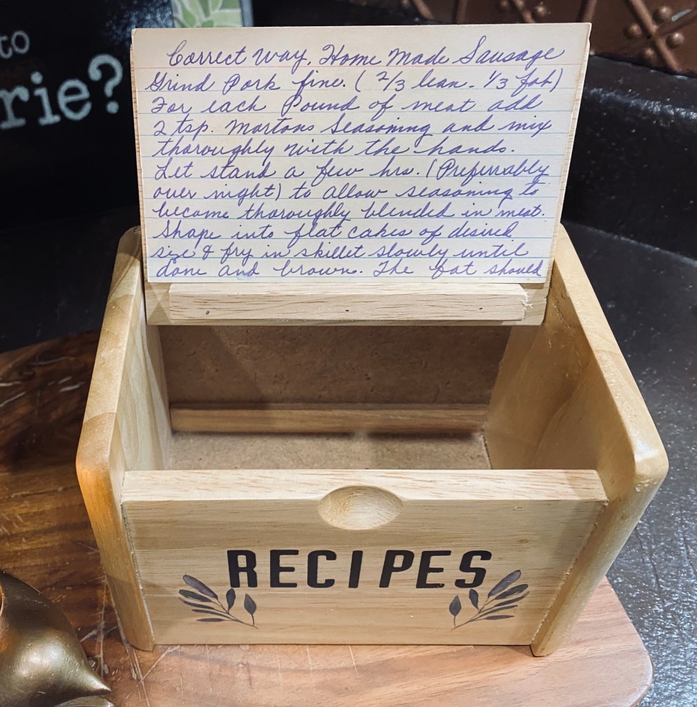 Aunt Ada’s recipe card for homemade sausage seemed like the perfect recipe to display. I love how she titled it “Correct Way” and how beautiful her handwriting was. 🥰