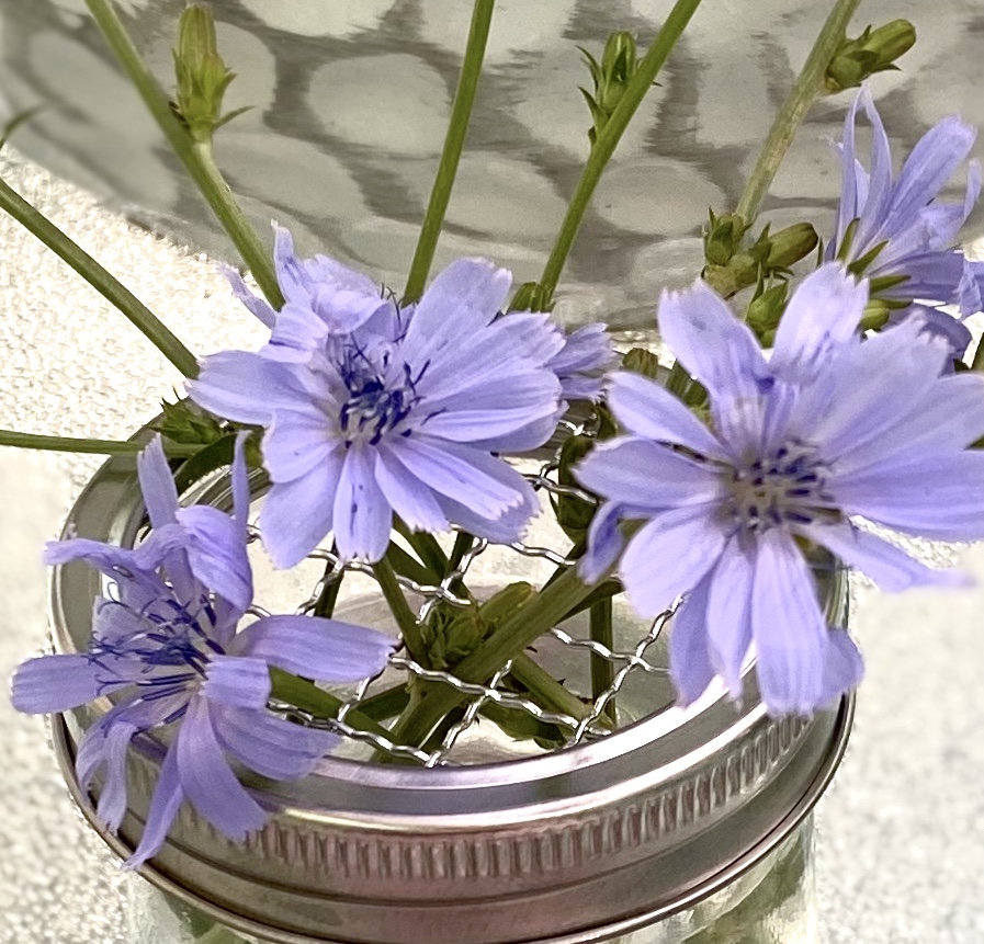 So, I put into these little jars some of the beautiful Missouri Chicory that grows through cracks in the asphalt in the grassy areas along our roads. I knew the blooms/buds would be mowed down soon, so I cut some. I also had a beautiful goblet I had thrifted the clay “frog” I made the other day and put some blooms/buds in it.