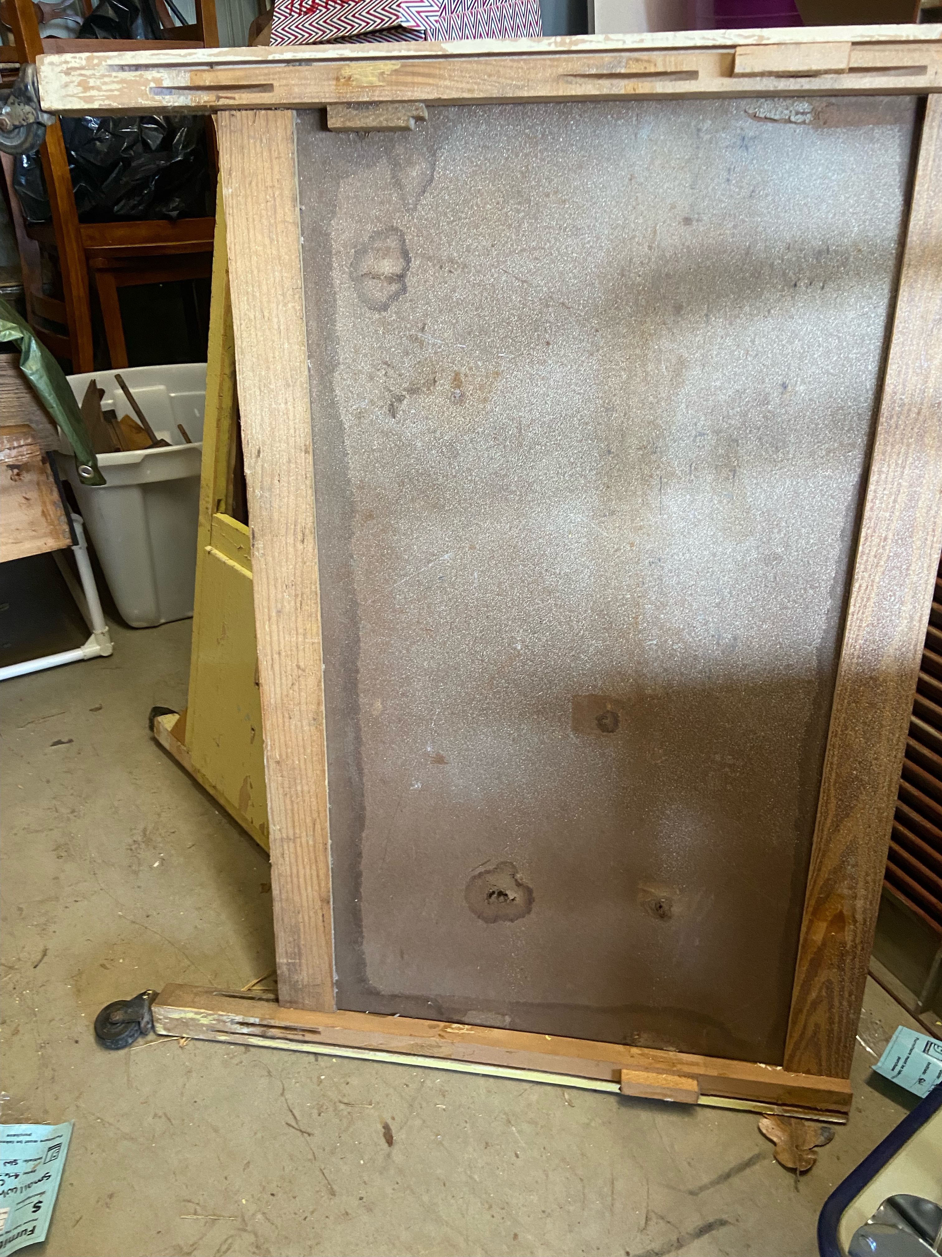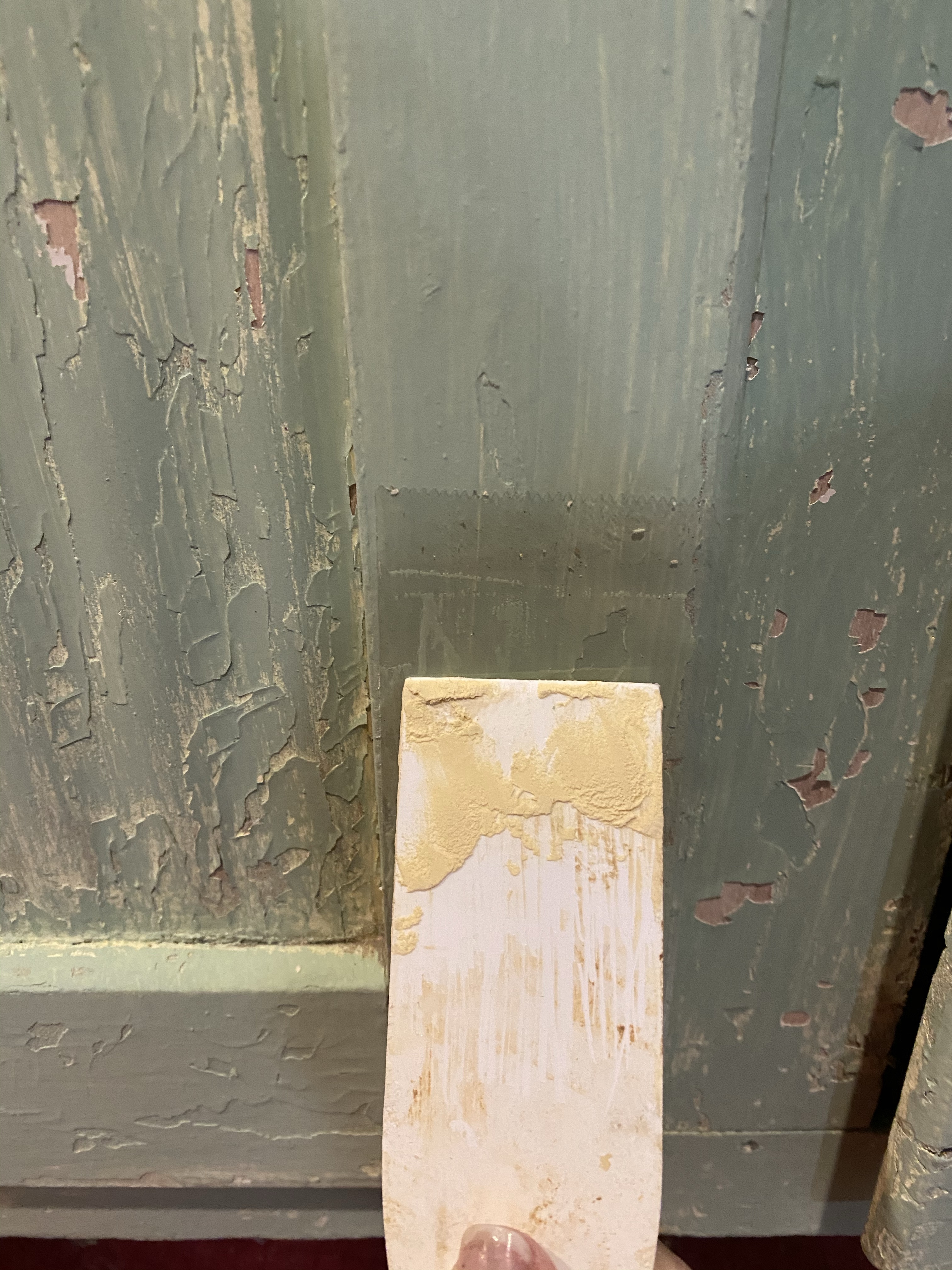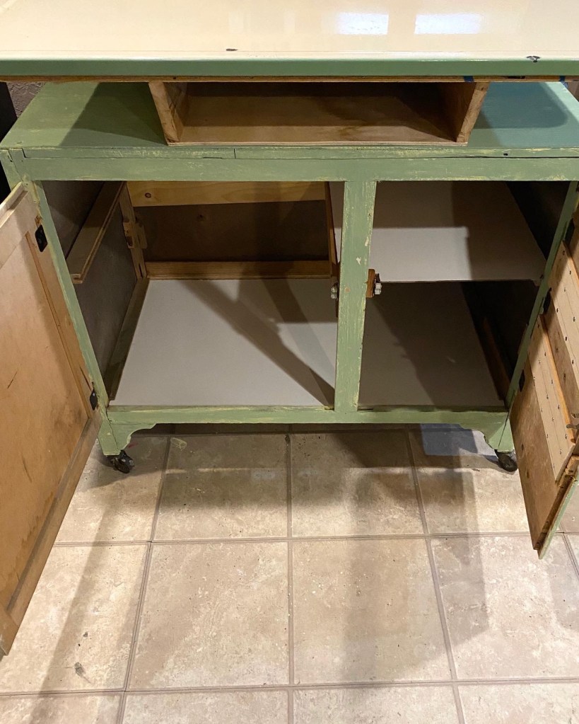 We recently thrifted a vintage cabinet. One drawer was missing a box so the front was just nailed to the cabinet. The cabinet had at least 3 layers of paint on some places, others had only one. It was falling apart.