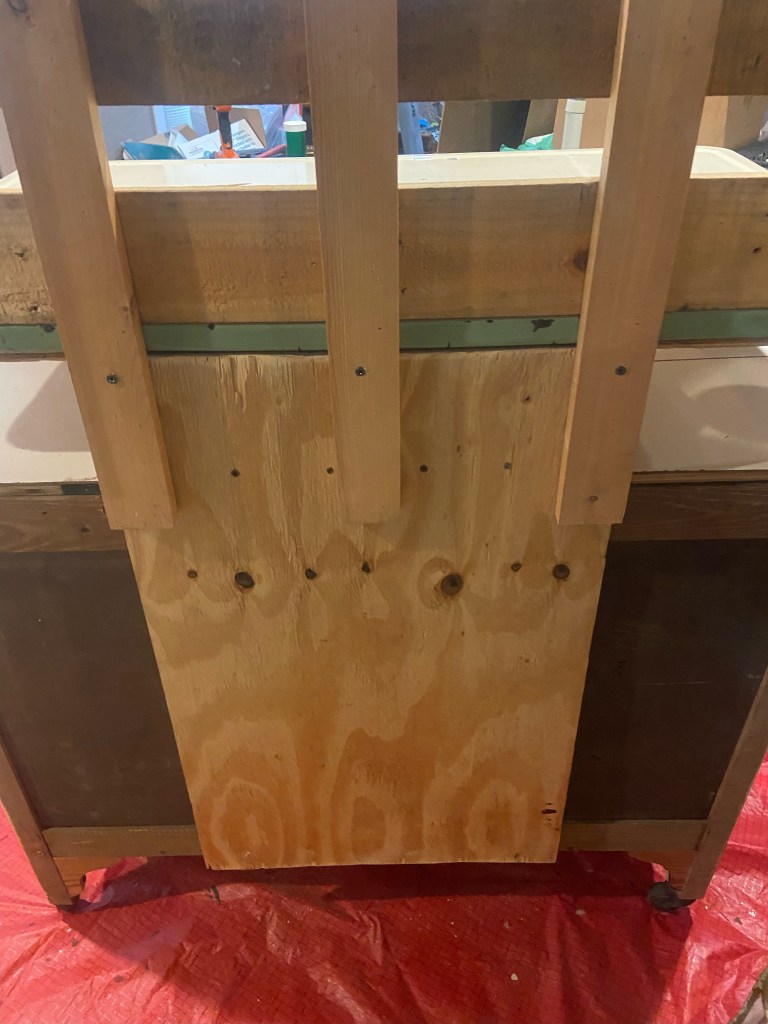 Danny took it all apart, and rebuilt it from scratch. He created another door from the fronts of all 3 drawers and added a bottom and a shelf on one side. He also added hardware to keep the doors closed. He added a wood box type thing to the top of the cabinet to raise it up to cabinet height once the metal top was added. He also added a pallet board rack.for hanging tools, etc. There is lots of storage for soil, pots, etc.