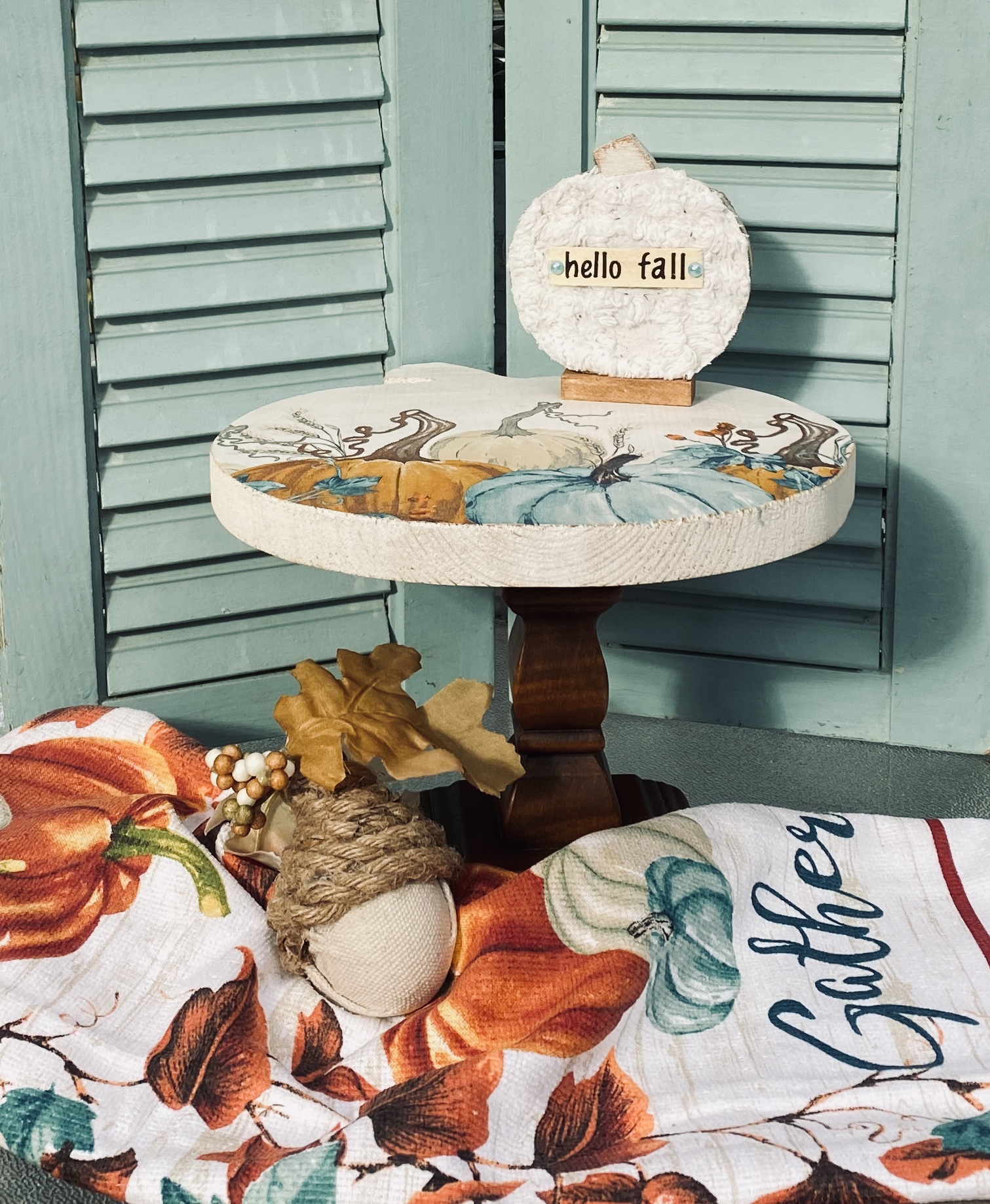 Played with the super pretty Dollar Tree napkins today. I made a riser from a pumpkin cut out. For this I painted the board white with slight distressing on the edges. It creates a completely different look than when applying it to raw wood. The other items were on the raw wood, with some distressing done using antique wax.