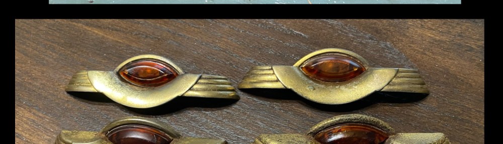 We’ve been working on an Art Deco dresser. Danny has taken it all apart and is rebuilding it. It is going to be beautiful! The detail is so pretty! But the drawer pulls are spectacular! They were so worn and discolored but still all in one piece. The red Bakelite inserts are in perfect shape and by themselves are valuable. I cleaned them, scrubbed them with Bar Keepers Friend, then waxed them and applied gold leaf RubnBuff. They are amazing!