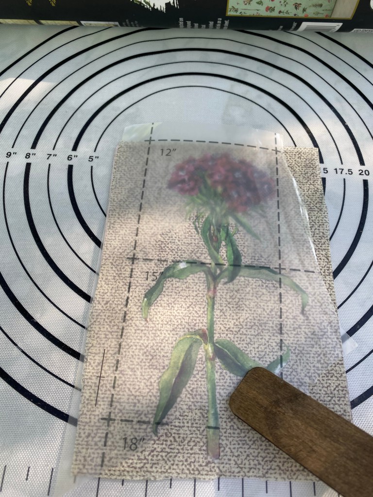 It was then time to apply the transfer to the material I had adhered to the piece of cardboard. I didn’t seal it as it is a decor piece and will not be handled much.