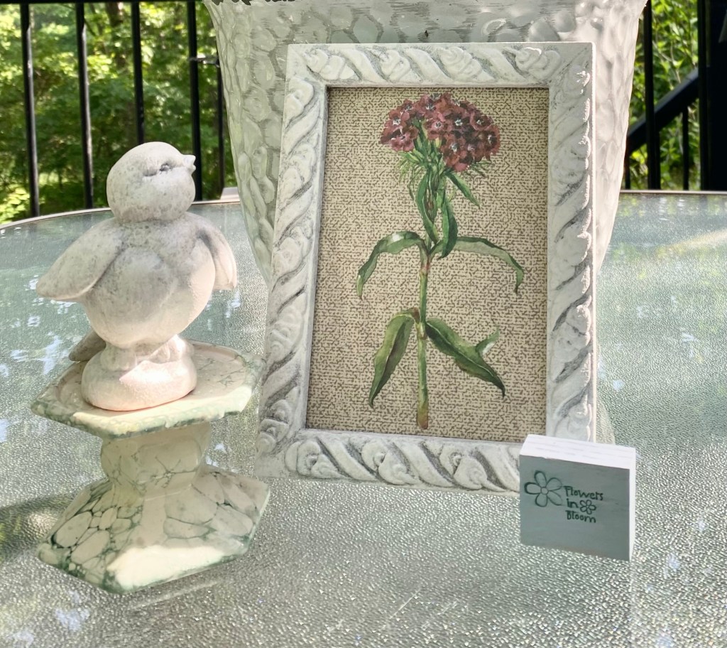 For today’s project I am up-cycling an old gold frame and adding a Redesign with Prima transfer from the Floral Collection. The transfer is applied to a unique background – a piece of one of Dollar Tree’s storage bins.