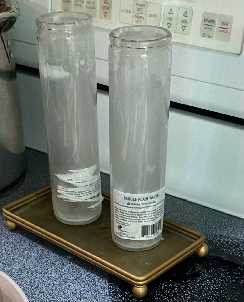 First of all, I’ve had a little gold metal riser for a year or two. I never knew what I would do with it. Today, I used it to put my hot melted candle wax jars on, so it was handy (I hadn’t put it away yet, either. 🙄)